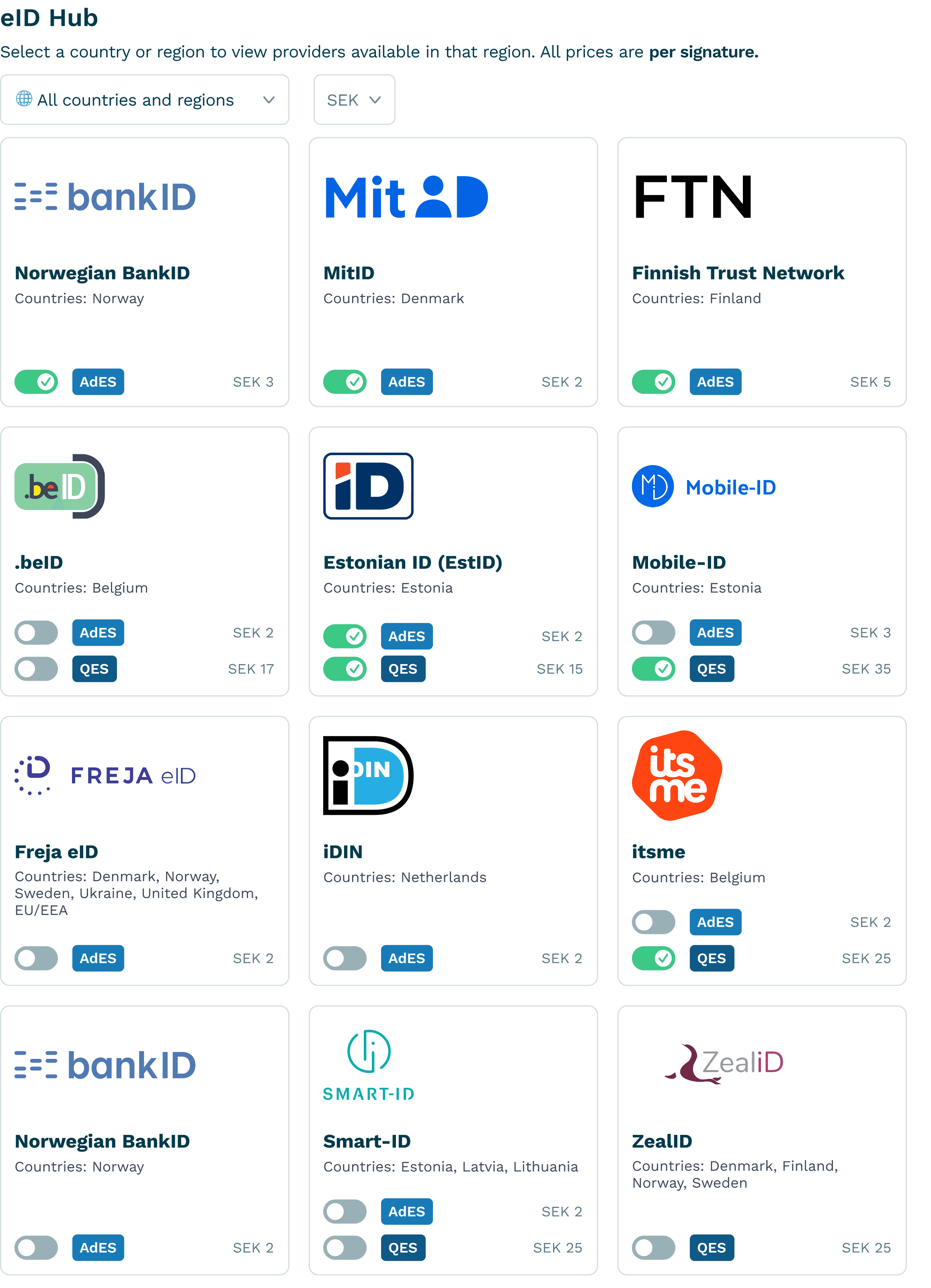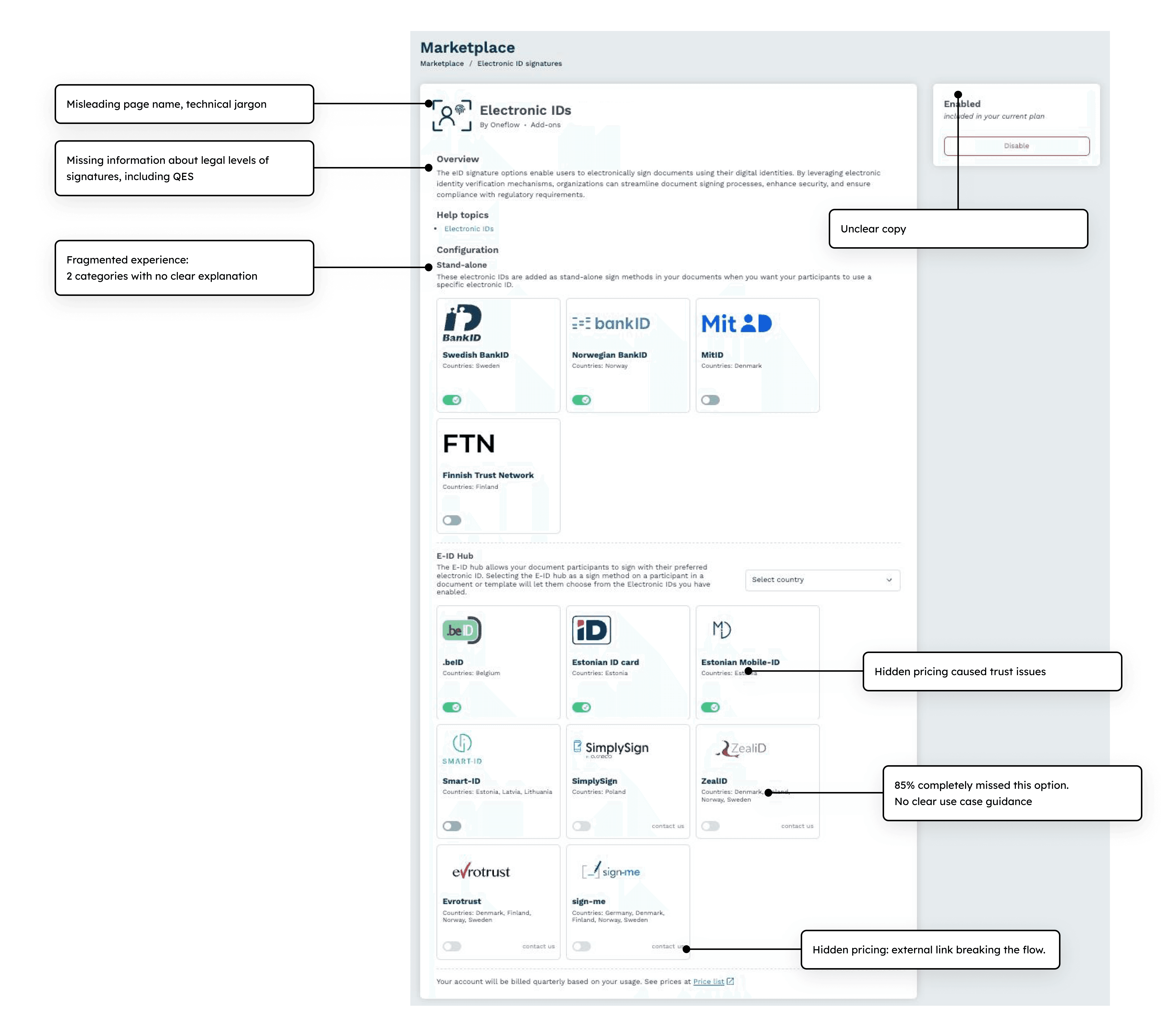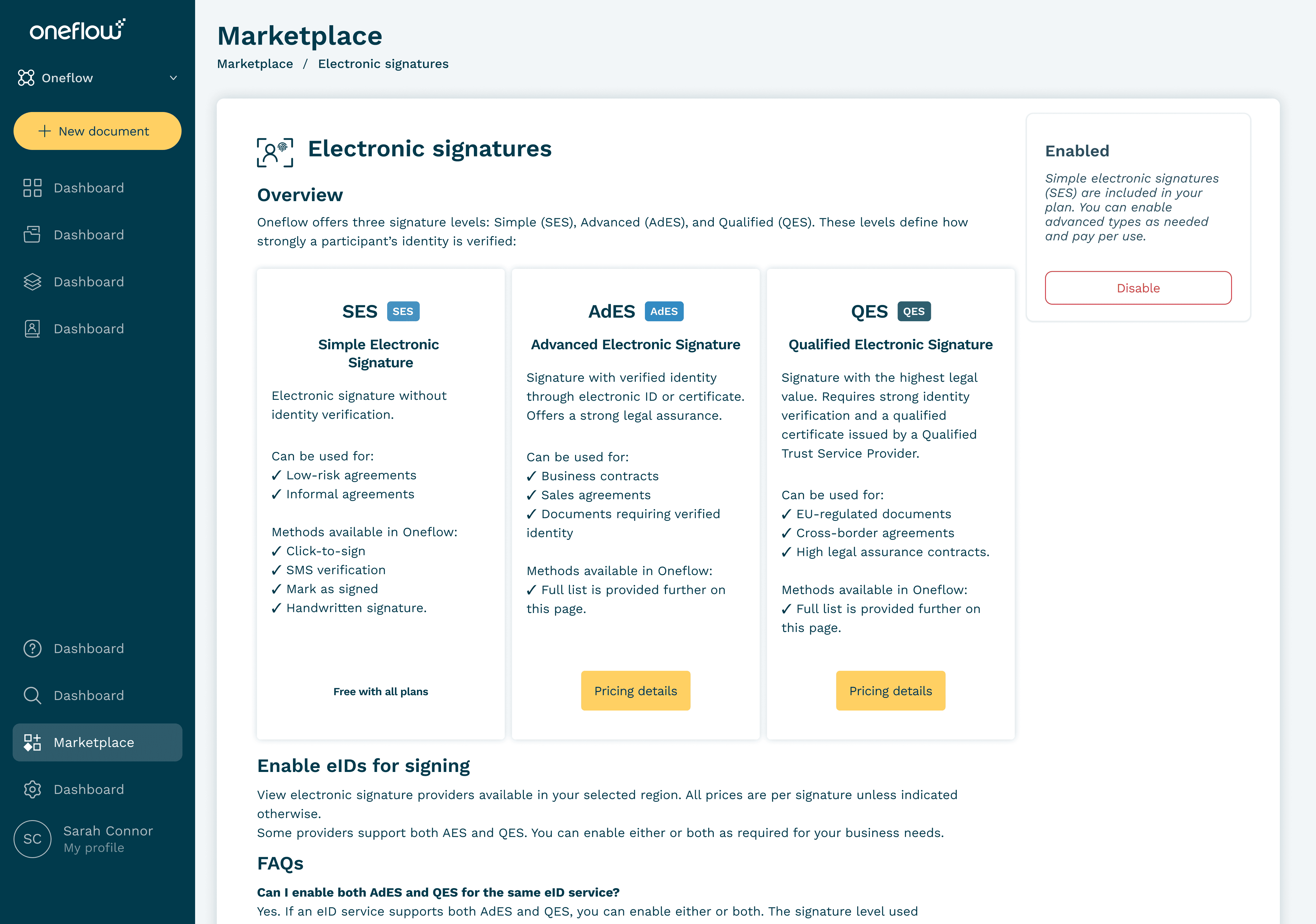 I rebuilt the entire marketplace around what users actually needed: "Electronic signatures" with clear security levels. SES for simple docs, AdES for business, QES for legal protection.